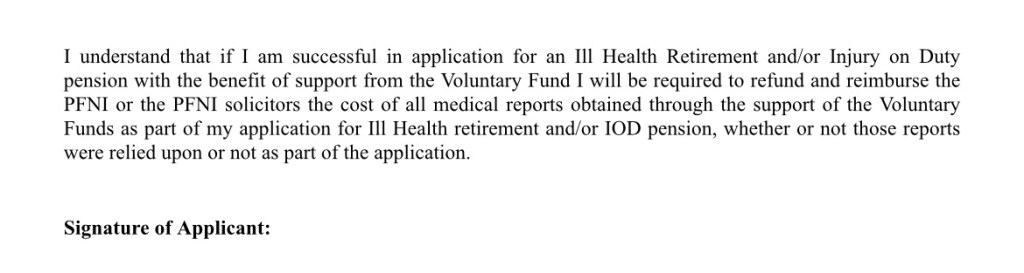 Each officer signs a crystal clear form promising to pay this money back if their medical retirement application is successful and only after they receive their pension lump sum. All other costs, including substantial legal fees, are paid by the Federation, these legal costs will amount to thousands of pounds & Sean is almost certain to have benefited from this support.