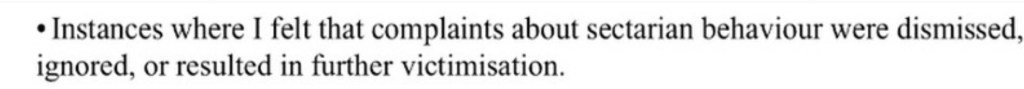 What does Sean mean by “instances where I felt complaints about sectarian behaviour were ignored, dismissed or resulted in further victimisation”.