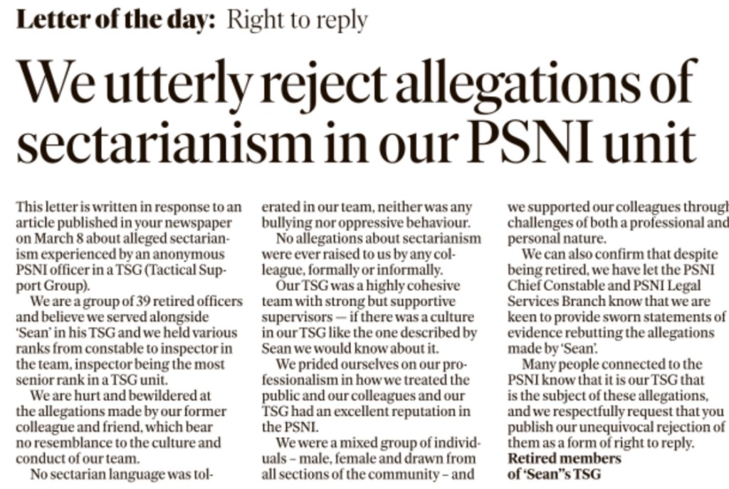 The retired officers who have rebutted his account are consistent, credible and cross community. The members of this group cover the entire time span Sean was in the TSG in question. They wish to swear on oath their team was the antithesis of a sectarian one.